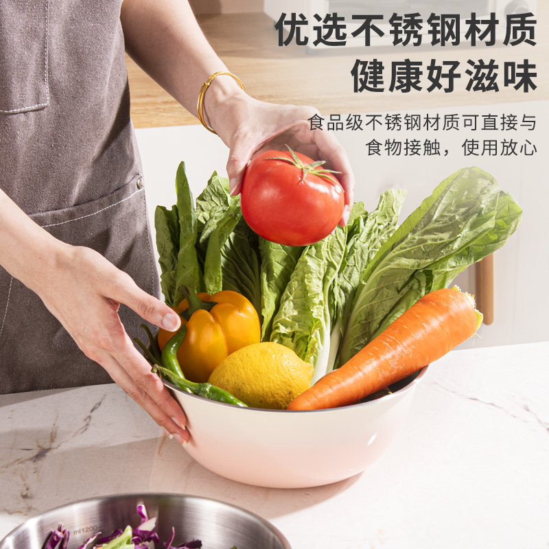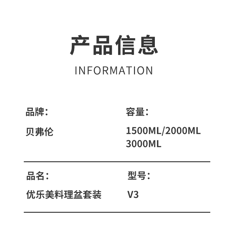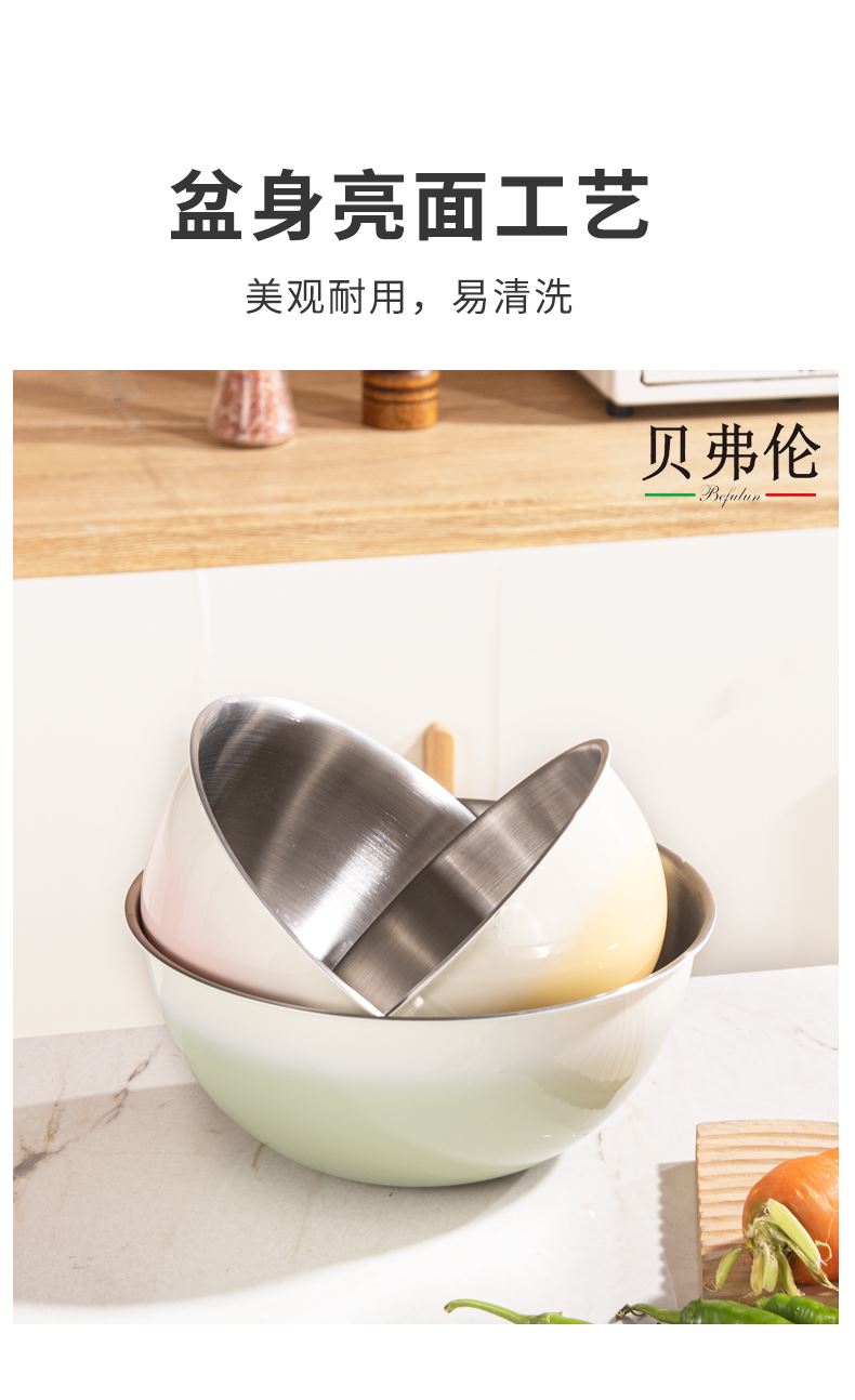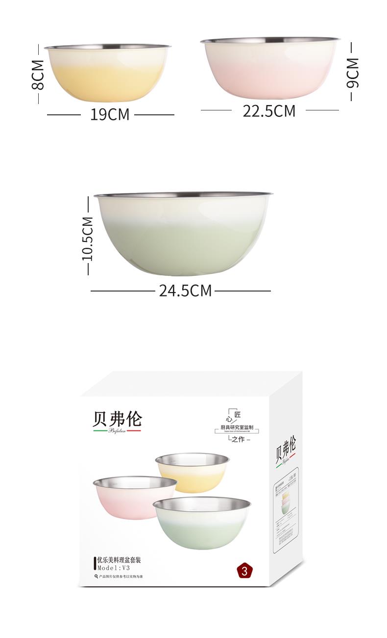 容量:1.5L+2L+3L 材质:奥氏体不锈钢(201) 包装尺寸:25.1*11*25.1cm 包装重量:0.75KG 拉丝抛光,易清洁,污渍不残留 加深设计,打蛋和面不飞溅 刻度标识,容量易掌握,控量更科学 一盆在手,厨房无忧