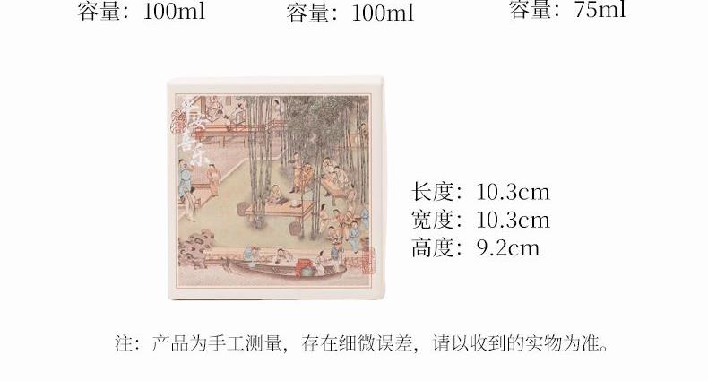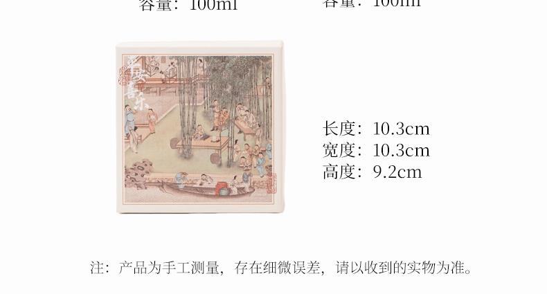 配置:茶杯*1,彩盒*1. 莲花杯长度:9.4cm高度:4.4cm容量:150ml, 事事如意长度:5.3cm高度:8cm容量:100ml, 仙桃杯长度:8.2cm高度:3.1cm容量:75ml, 莲蓬杯长度:8.8cm高度:3.6cm容量:100ml, 祥云杯长度:8.8cm高度:4.0cm容量:100ml, 石榴杯长度:8.3cm高度:3.3cm容量:75ml。 彩盒长度:10.3cm宽度:10.3cm高度:9.2cm。 此款无手提袋!